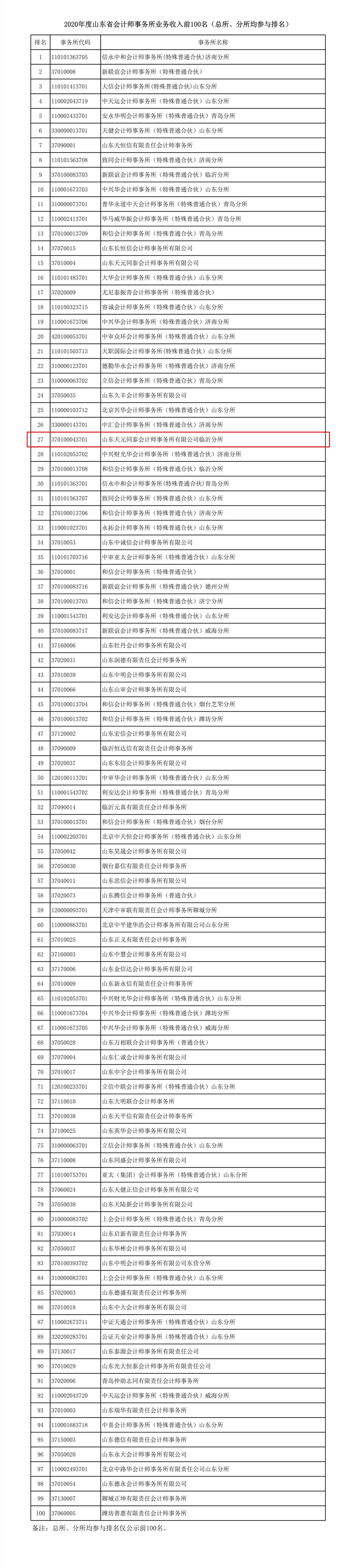 2020年度山東省會計師事務所業務收入前100名(總所、分所均參與排名)